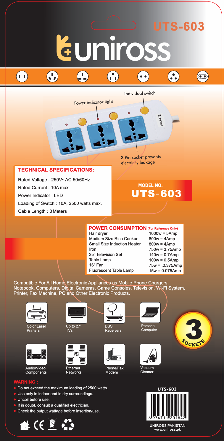 Sockets : 3 x Universal Sockets with Individual On/Off Switch