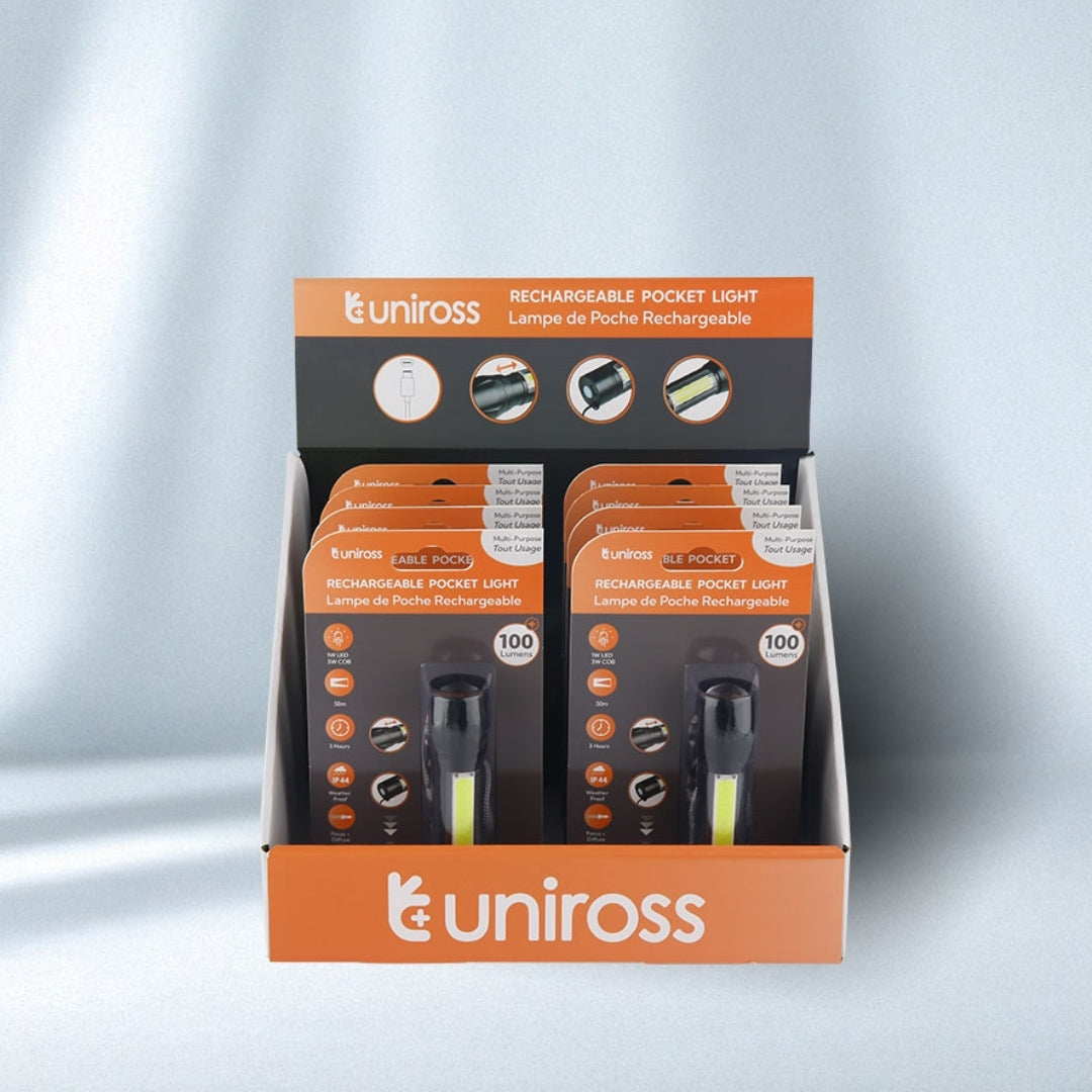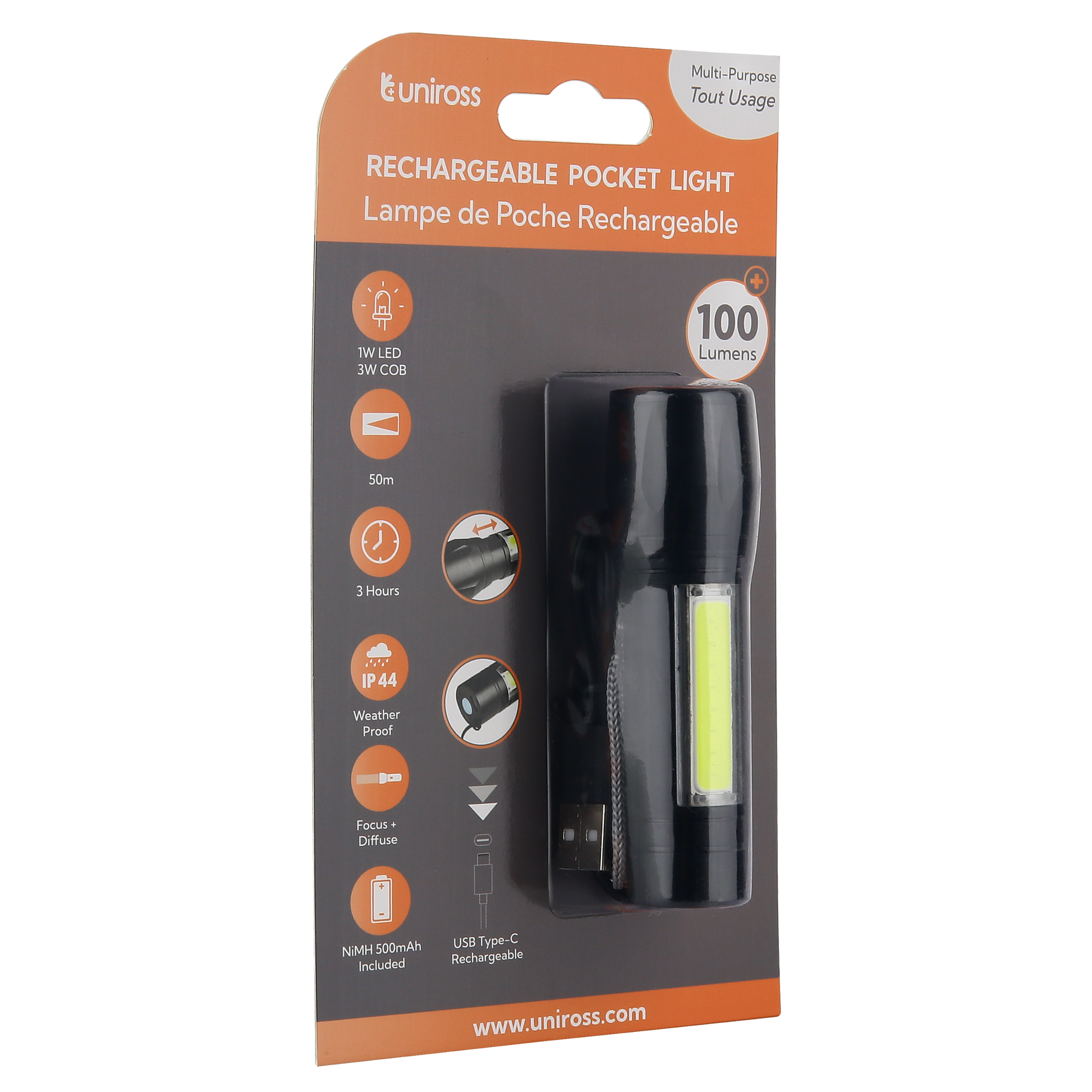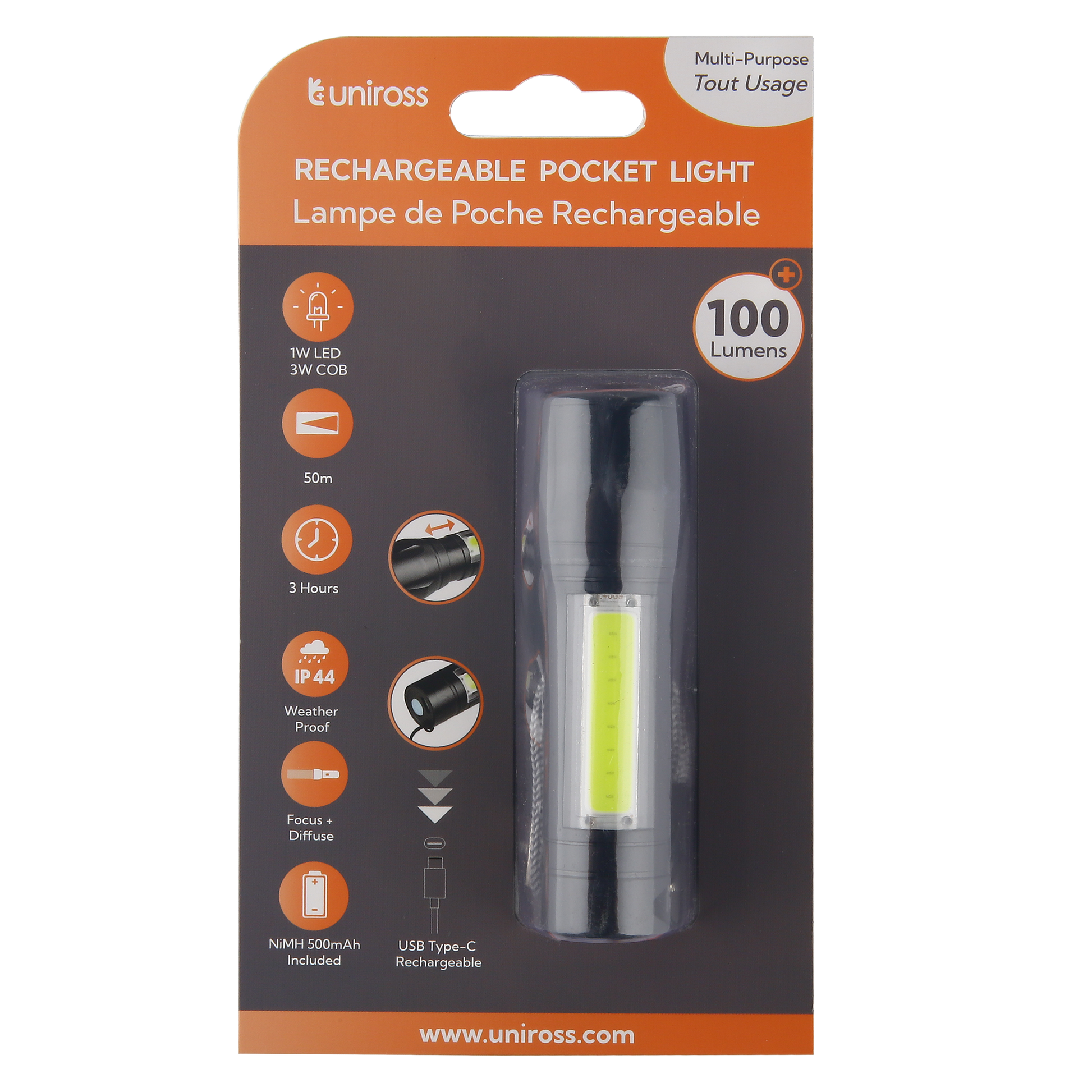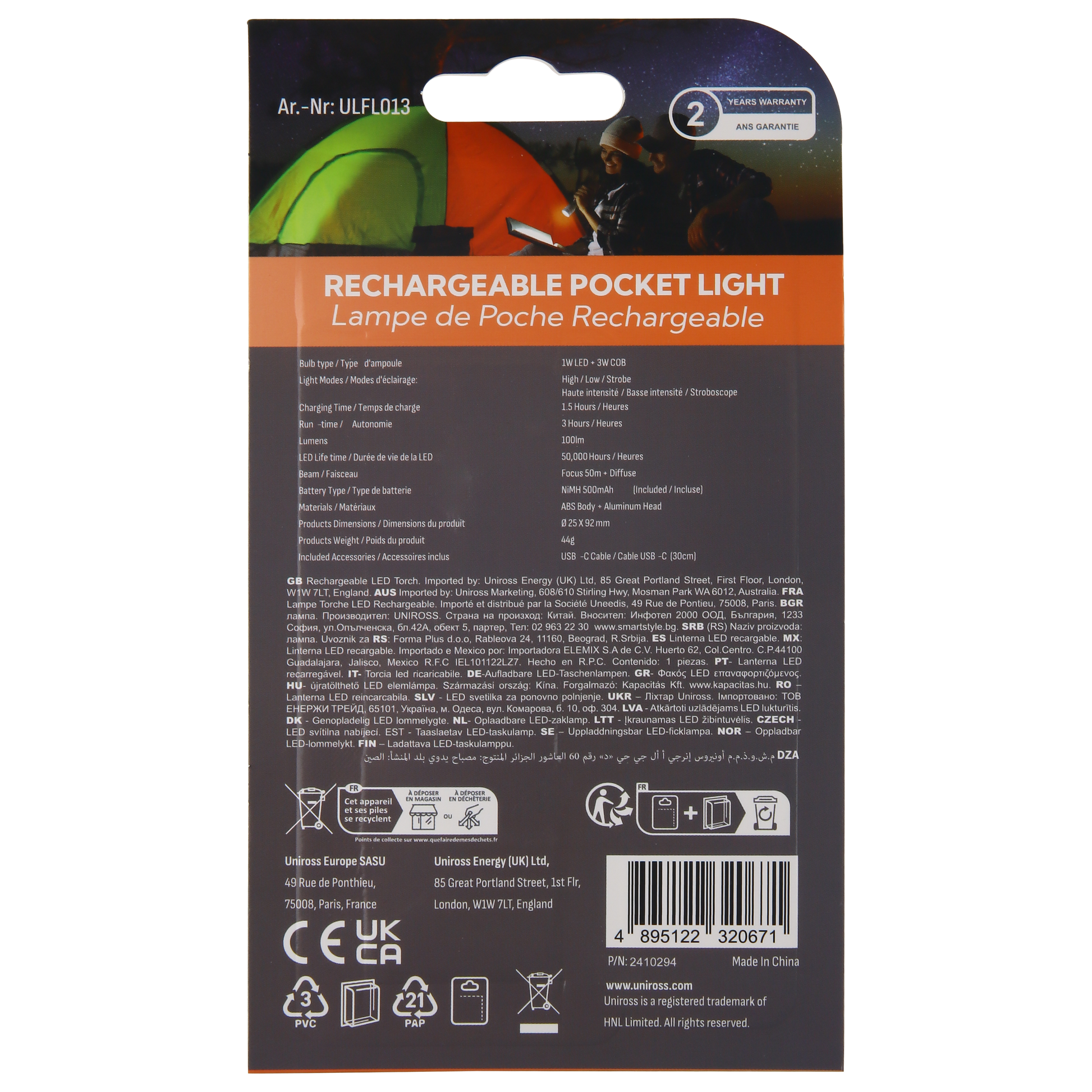 Uniross Rechargeable Pocket Light delivers 100 lumens of bright, even light for various applications. Built with durable ABS construction, this light is waterproof (IP44) and comes with a shatterproof lens for reliability in harsh conditions. Powered by an included rechargeable NiMH AA battery, it offers over 4 hours of runtime. Its compact design, combined with easy USB recharging, makes it the perfect portable light source for outdoor or emergency use.