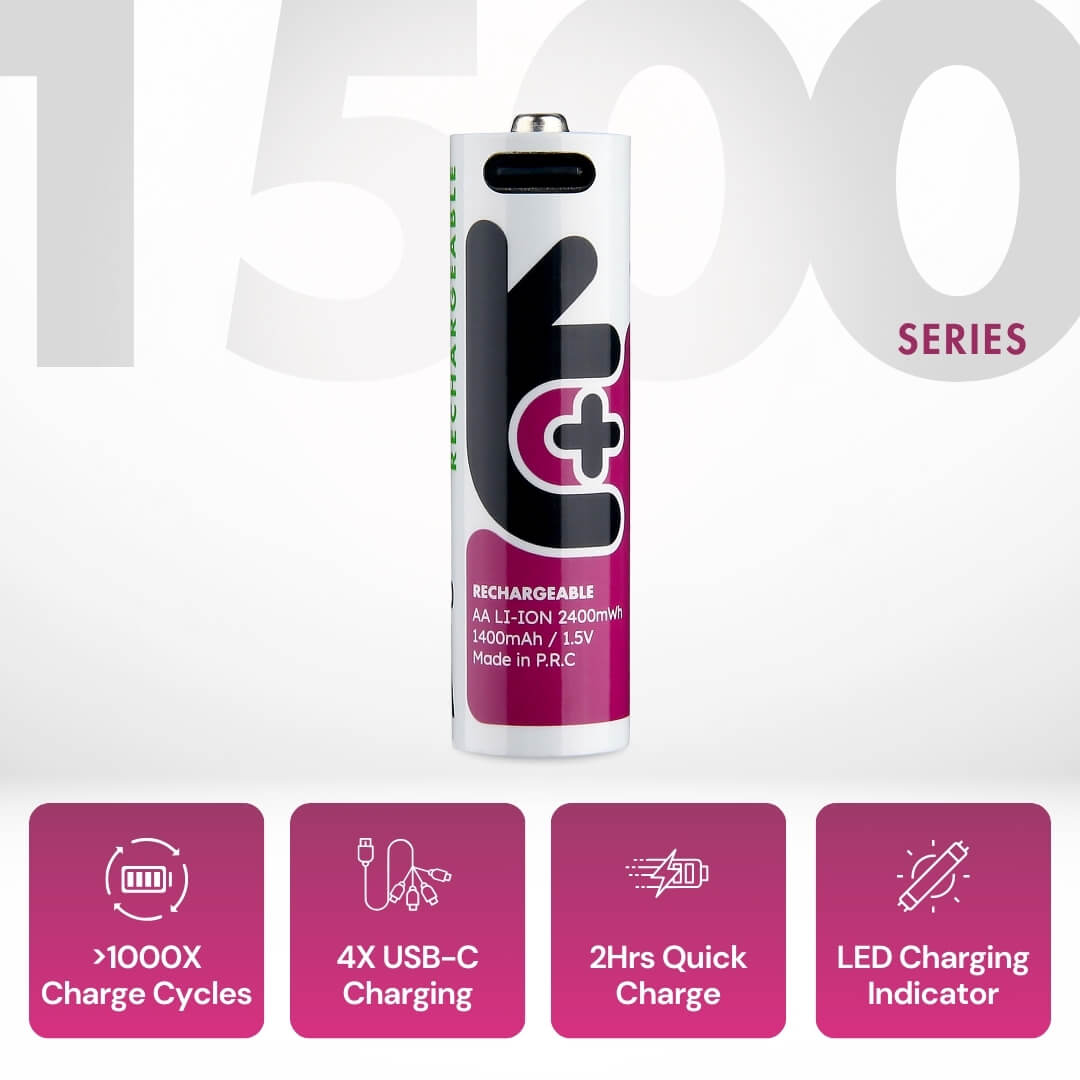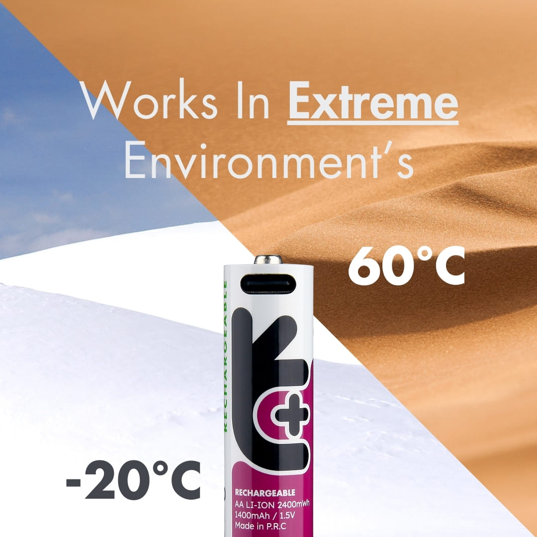Uniross USB-C Rechargeable AA Battery (Pack of 4) are high-quality lithium-ion batteries that deliver a stable 1.5V output for 95% of their runtime, ensuring consistent device performance. Equipped with integrated electronics, they are protected against overcharging, overloading, short circuits, and deep discharges. The wide temperature range (-20°C to +60°C) makes them perfect for various devices, from wireless keyboards to electric toys. With a 2400 mWh capacity and fast 2-hour charge time via USB-C, enjoy extended usage and up to 1000+ recharge cycles.